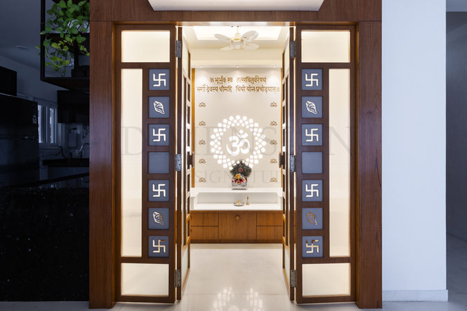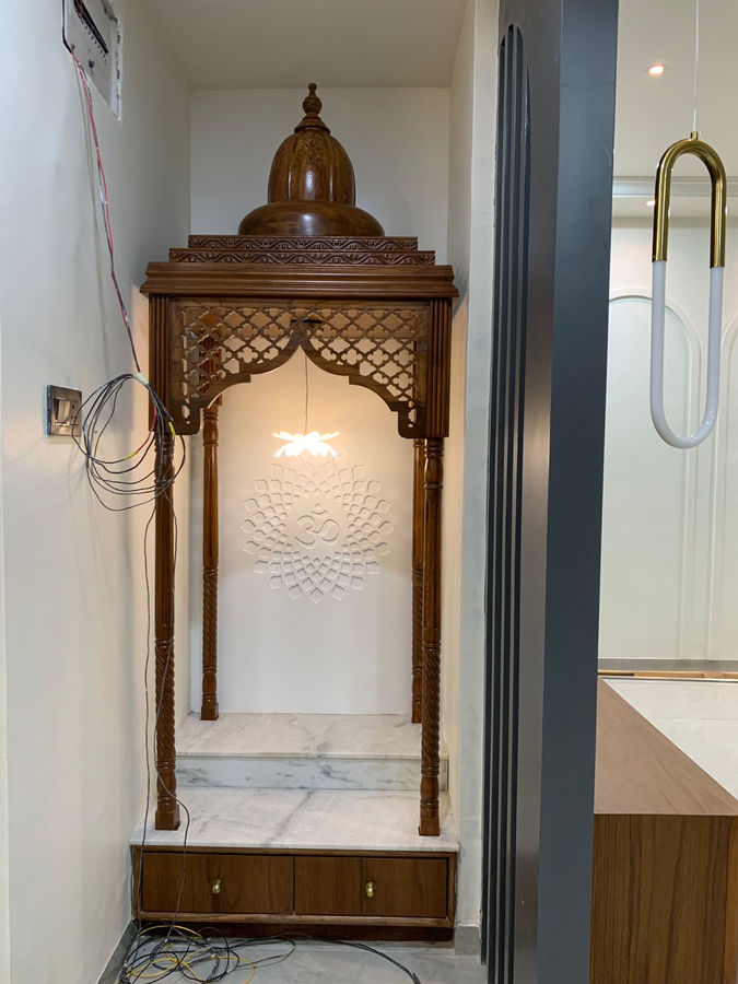A mandir/puja room in the house is a place where we are most at peace and in a divine environment.Each mandir has mdf cuttings and frost glass to keep privacy while doing puja. After entering the puja room it give the feel of surrealism.