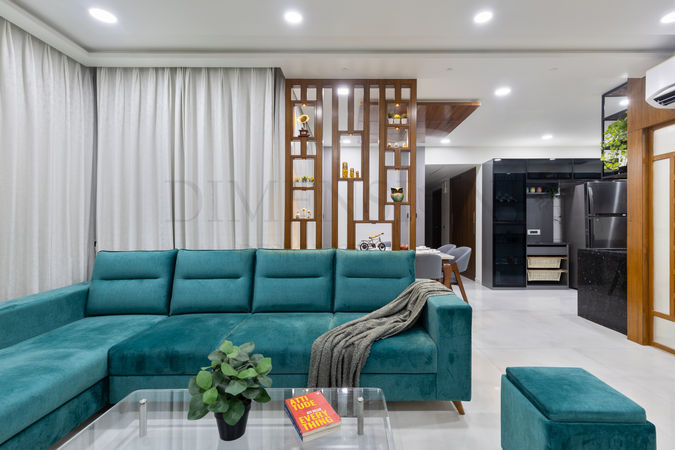 The living room emanate a warm and cozy ambience with the ply of earthy hues. The appearance of popping colored sofa souse the space with liveliness.